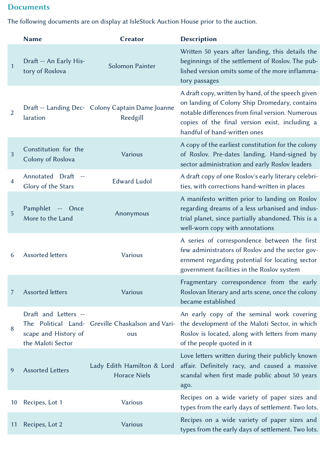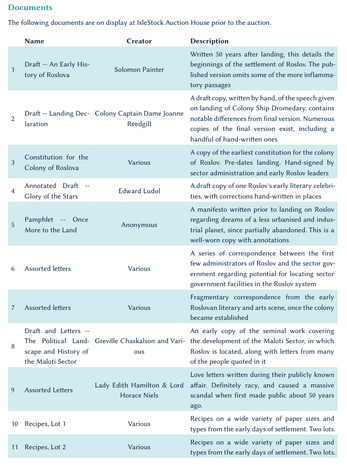 The arts and antiquities connoisseurs of Roslov (and the nearby sector) have been buzzing recently with the news that part of the art and antiques collection owned by Dame Diana Moore is being auctioned off. The PCs have been invited to a preview of some of the lots that will be on offer. But despite the refined air of the gallery at IsleStock Auction House, there is something not quite right with all of the lots….